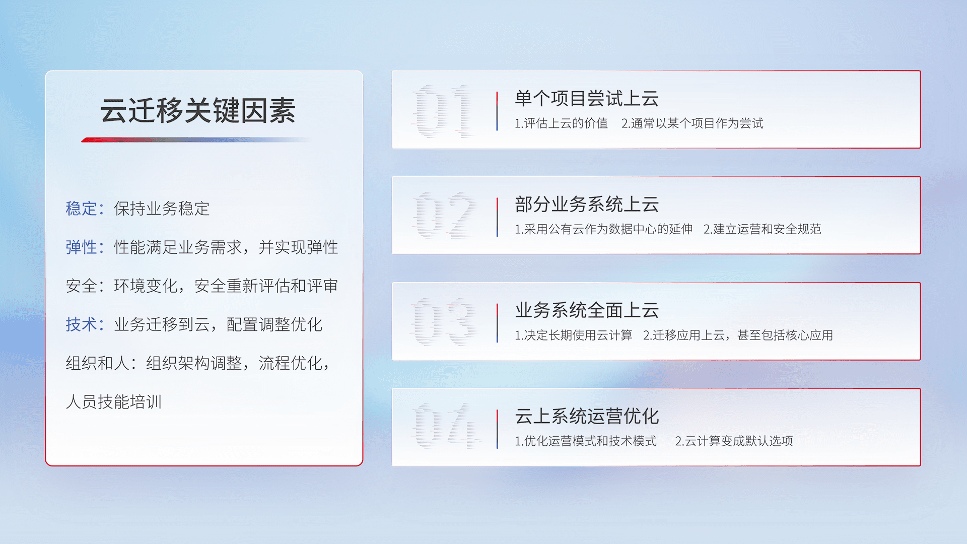 结合实际业务,,,,从规划设计、、、云平台选型、、、云原生改造、、、数据迁移、、、集成交付,,,迁移全过程为客户识别最佳上云路径,,,做好风险识别管理,,,设计网络架构、、、、身份权限、、、、安全审计合规、、、操作审计、、日志审计、、、、监控告警策略、、、多站点容灾设计等,,对云上基础设施进行整体规划,,,提升IT治理水平,,,以满足弹性、、高可用、、、、高性能的需求。。