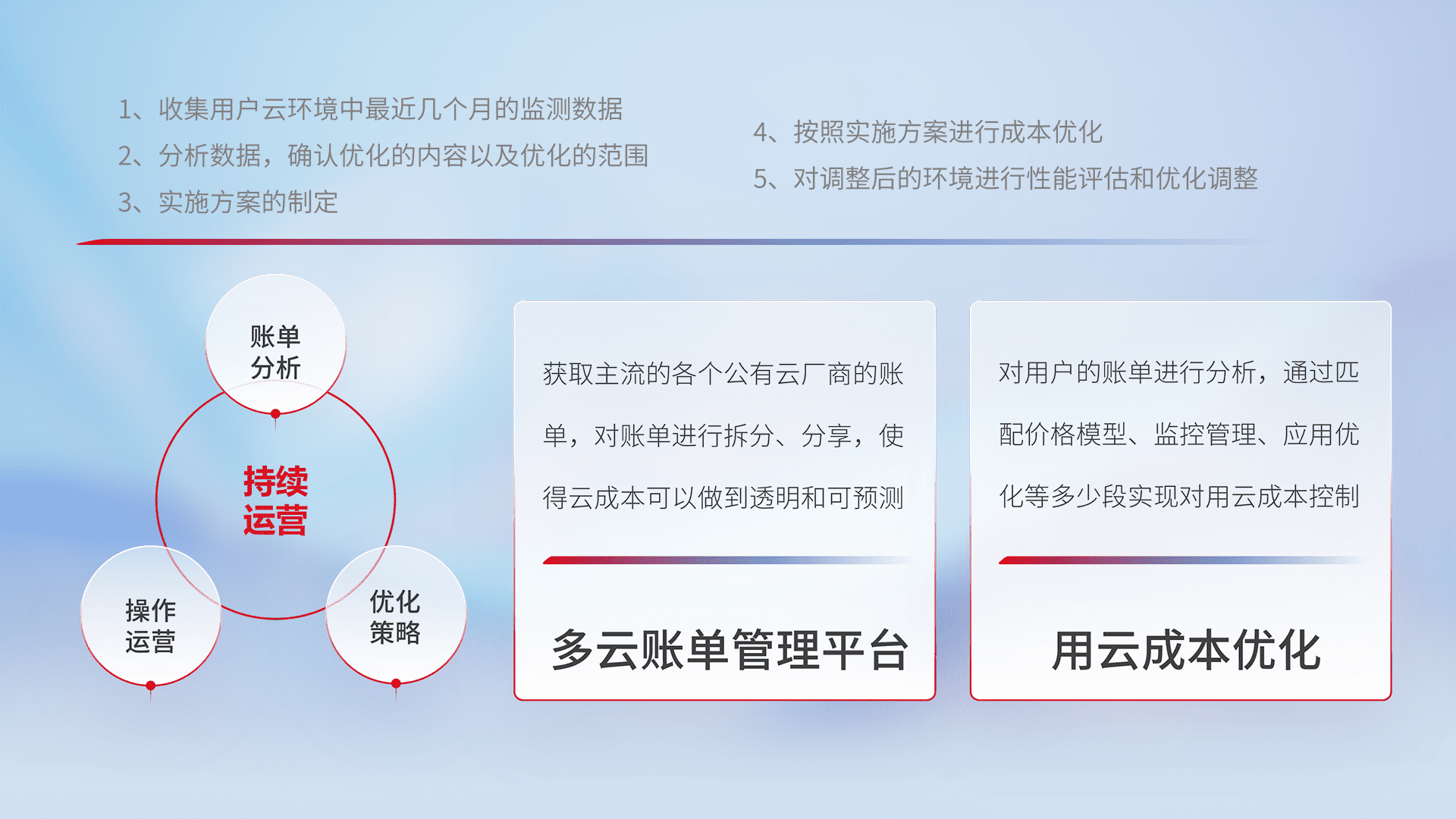 通过多云纳管,,,以统一的资源数据模型把客户的云资源进行抽象和封装,,,,进而实现对多云资源的统一操作,,保障云资源管理的可靠性、、稳定性与可用性。。量身定制化运维内容,,配置、、、开发运维、、补丁管理、、、备份、、监控、、、、认证和访问管理、、、审计和日常巡检等,,,,保障在用云过程中的可靠度,,,,稳定度以及高可用率。。